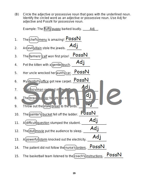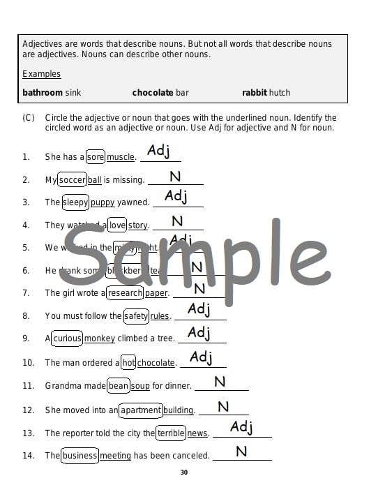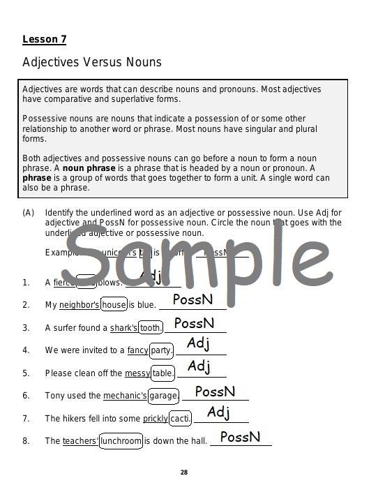The goal of Level 7 is to reinforce the word classes (parts of speech, grammatical forms) of English taught in Level 1, Level 2, Level 3, Level 4, Level 5, and Level 6. Level 7 includes nouns, determiners, pronouns, verbs, phrasal verbs, modal verbs, adjectives, adverbs, prepositions, postpositions, coordinating conjunctions, correlative conjunctions, subordinating conjunctions, and interjections. Level 7 reinforces noun phrases, determiner phrases, adjective phrases, adverb phrases, verb phrases, prepositional phrases, postpositional phrases, adverb clauses, adjective clauses, and noun clauses as well as grammatical functions such as subject, predicate, direct object, indirect object, object complement, appositive, noun phrase modifier, determinative, verb phrase complement, adjective phrase complement, prepositional complement, adverbial. Level 7 also reinforces functional versus lexical verbs, complex predicates, compound subjects and predicates, internal structures of adjective clauses and noun clauses, sentence structure, and extraposition.