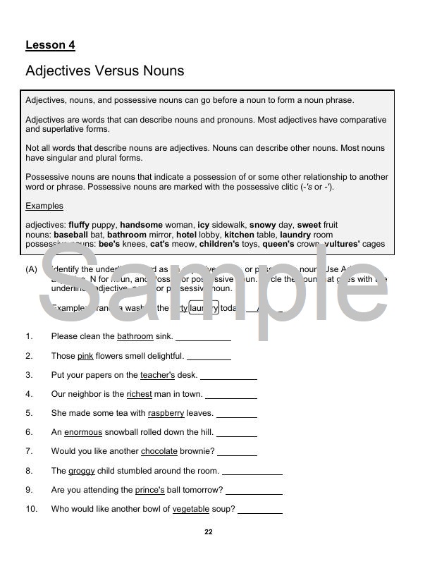 The goal of Level 8 is to reinforce the word classes (parts of speech, grammatical forms) of English taught in Level 1, Level 2, Level 3, Level 4, Level 5, Level 6, and Level 7. Level 8 includes nouns, determiners, pronouns, verbs, phrasal verbs, modal verbs, adjectives, adverbs, prepositions, postpositions, coordinating conjunctions, correlative conjunctions, subordinating conjunctions, and interjections. Level 8 reinforces noun phrases, determiner phrases, adjective phrases, adverb phrases, verb phrases, prepositional phrases, postpositional phrases, adverb clauses, adjective clauses, and noun clauses as well as grammatical functions such as subject, predicate, direct object, indirect object, object complement, appositive, noun phrase modifier, determinative, verb phrase complement, adjective phrase complement, prepositional complement, adverbial. Level 8 also reinforces functional versus lexical verbs; sentence structure including compound and complex subjects, predicates, and sentences; internal structures of subordinate clauses; and extraposition.