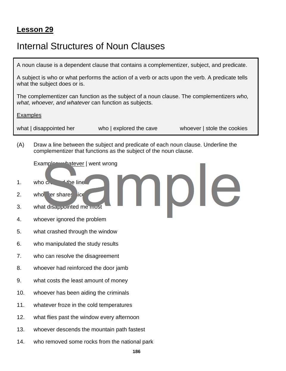 The goal of Level 6 is to reinforce the word classes (parts of speech, grammatical forms) of English taught in Level 1, Level 2, Level 3, Level 4, and Level 5. Level 6 includes nouns, determiners, pronouns, verbs, phrasal verbs, modal verbs, adjectives, adverbs, prepositions, postpositions, coordinating conjunctions, correlative conjunctions, subordinating conjunctions, and interjections. Level 6 reinforces noun phrases, determiner phrases, adjective phrases, adverb phrases, verb phrases, prepositional phrases, and postpositional phrases as well as grammatical functions such as subject, predicate, direct object, indirect object, object complement, noun phrase modifier, verb phrase complement, adjective phrase complement, prepositional complement, and adverbial. Level 6 also introduces determinatives and appositives and delves into deeper detail of the internal structures of adjective clauses and noun clauses. Level 6 finally introduces sentence structure and extraposition.
